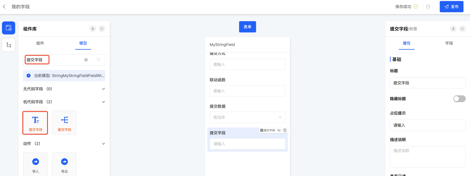 2: 在模型区域,搜索提交方式,如果找到了,就把该字段拖拽进来, 如果找不到,就在元件中的组件区域,拖拽一个文本字段,按照下面的配置进行配置,然后保存