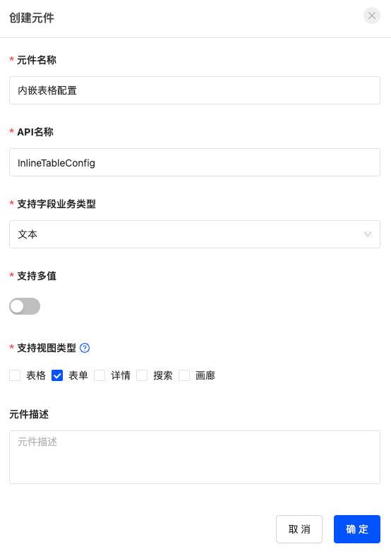 因此我们可以实现一个【内嵌表格配置】组件,并且该组件允许在【表单】视图中使用。其业务类型使用【文本】,我们在保存配置数据时,可以使用JSON数据结构来存储复杂结构。(这里的实现思路并非是最符合协议设定的,但可以满足绝大多数组件场景)